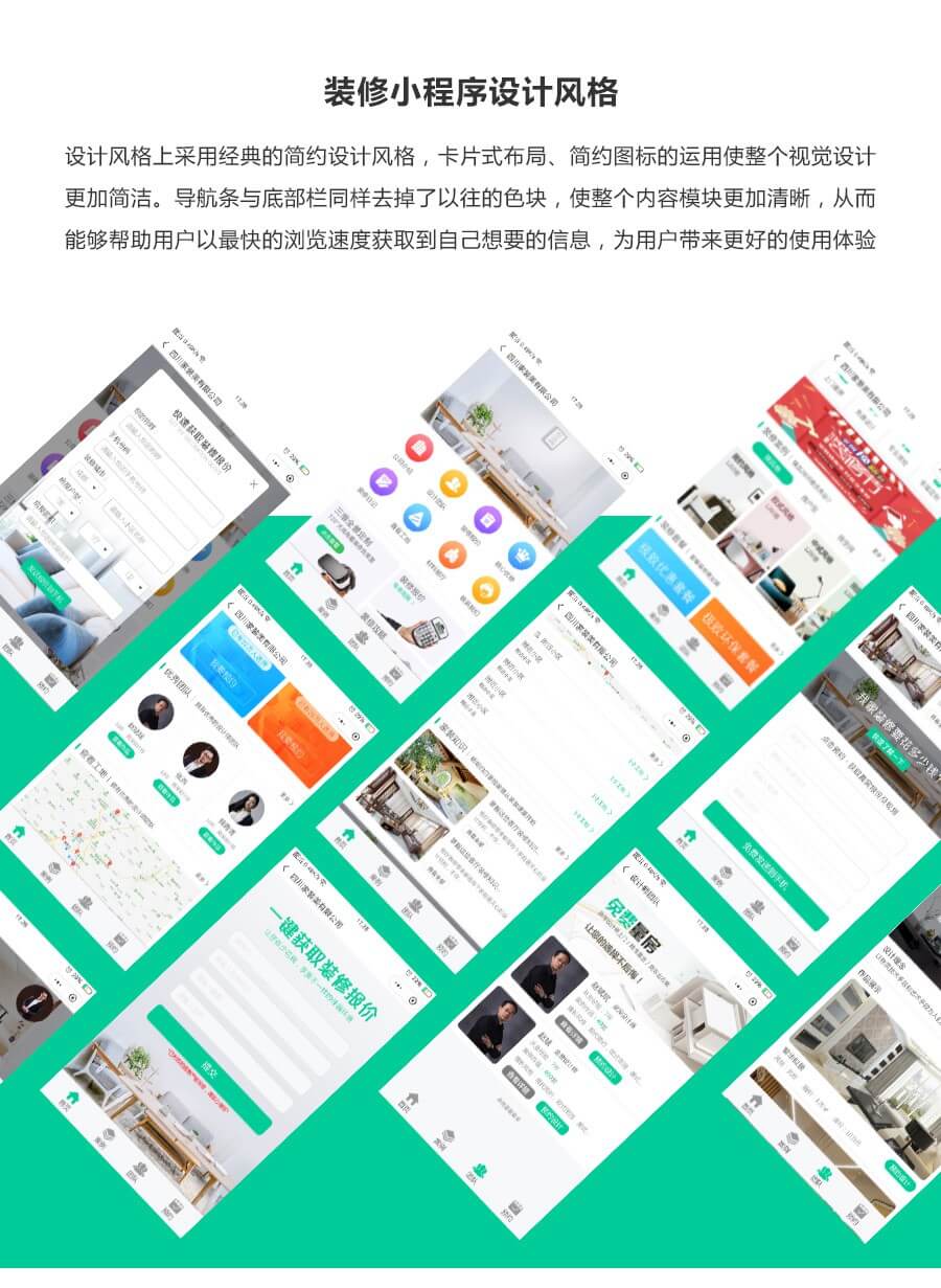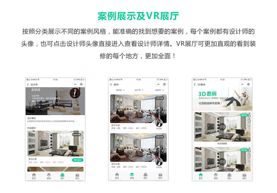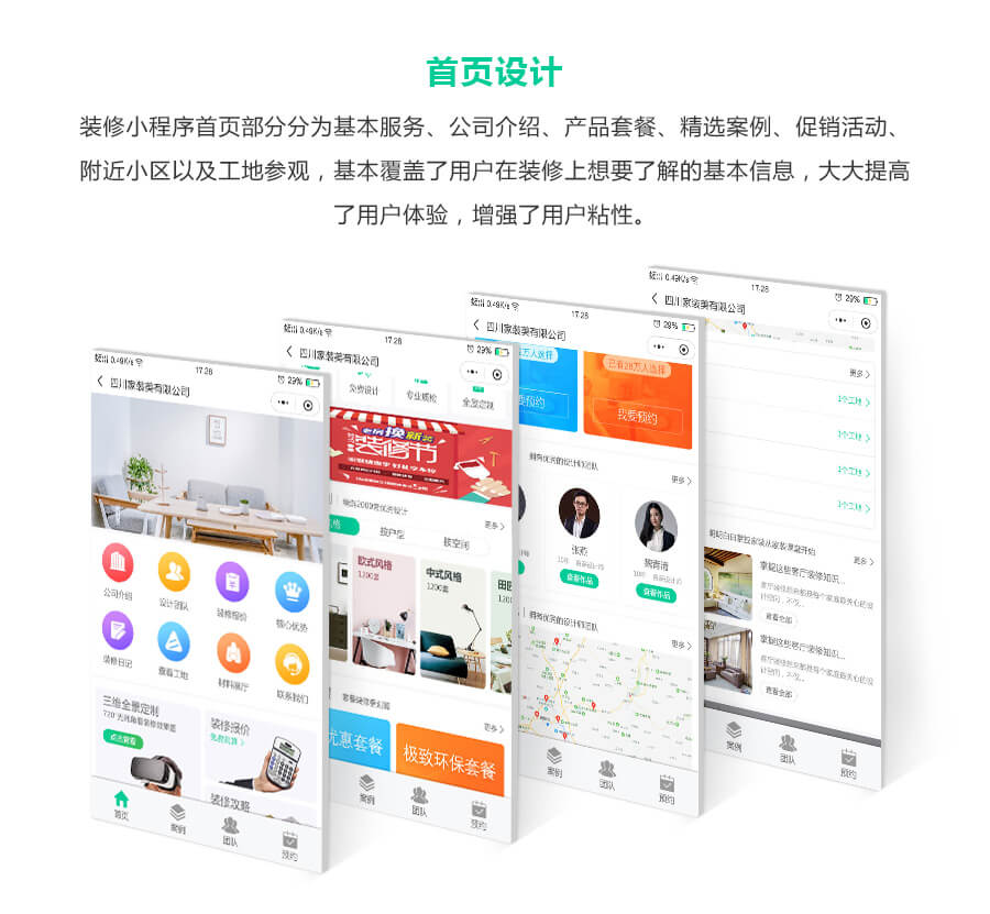 解决装修公司微信端快速传播营销的功能。公司设置,促销设置,小区设置,案例设置,团队设置,电话设置,可用VR展示,支持查看工地进度。