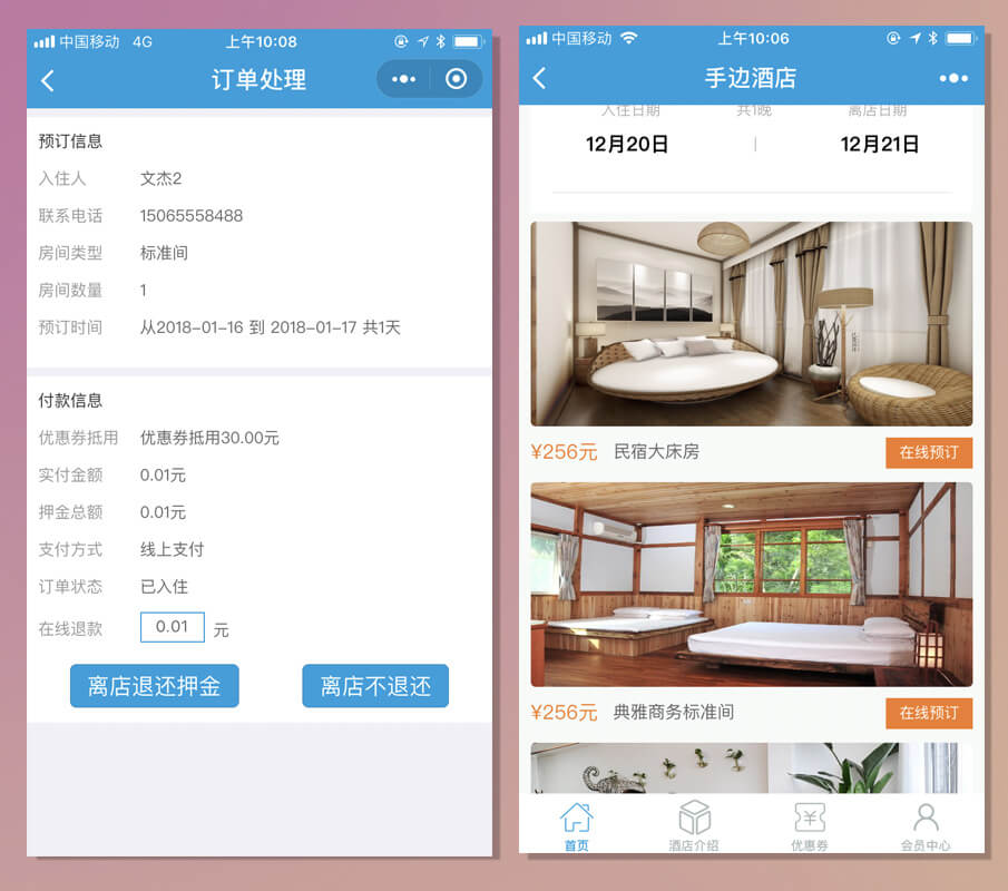 后台支持一键入住,一键退款、退押金、钟点房。支持微信支付、模板消息。客服实时收到新的订单信息,可以在手机端处理订单,支持按日期维护房价和房间数量,支持到店付款。支持积分功能,完成订房后获得的积分可以兑换代金券或优惠券,支持无线打印机和短信,评价打分功能,会员等级功能,二维码核销,积分或特产商城,会员充值
